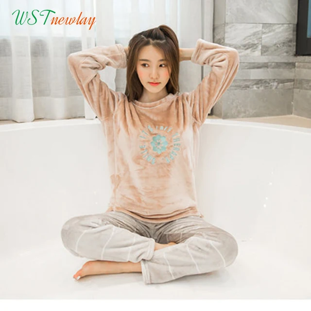 Зимние пижамы для женщин полиэстер Полный мотобрюки леди из двух частей пижамный комплект мультфильм фланель Женская домашняя одежда