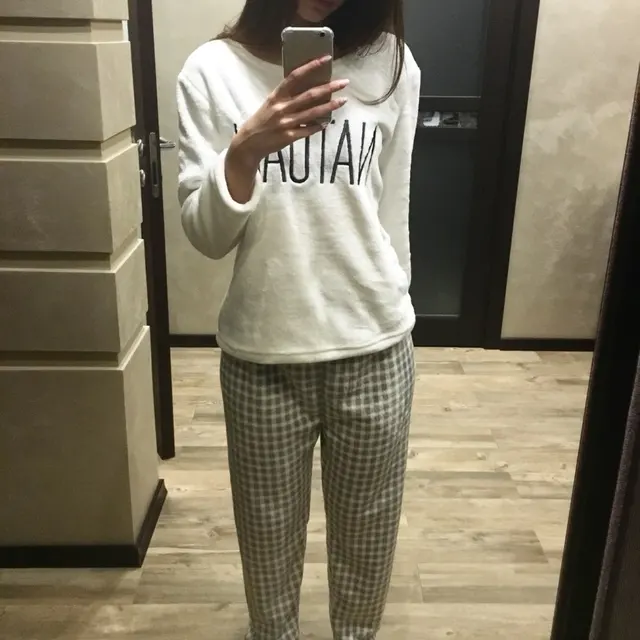 Пижама симпатичная, ткань такая же как шьют плюшевые детские игрушки, правда довольно толстая, поэтому одеваешь и сразу чувствуешь тепло)) На размер S (наш 44-46, рост 167) брала китайский размер L, в итоге штаны более-менее нормально, а кофточка немного великовата, но это лучше, чем наоборот)) Штаны сшиты по странной выкройке, нет ярко выраженного зад/перед. Посылка шла месяц, была доставлена курьером, но упаковано плоховато, целофановый пакет был порван. После стирки на 40 град, с пижамой все в порядке - не села и не полиняла. В целом все нормально, для тех кто хочет съэкономить рекомендую ;))