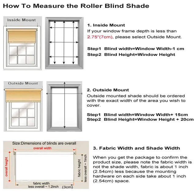Когда вы получаете пакет, чтобы подтвердить размер продукта, обратите внимание ткани шириной не ролик занавес ширина, ткань о3 см (1,2 дюймов)Меньше, потому что монтаж оборудования на каждой стороне займет около 3 см пространства. Ролик занавес ширина для общая ширина ролика включая аппаратные средства, не для ткани шириной.